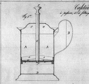 Through the history of coffee consumption human ingenuity has been applied to how best to extract the flavours and oils from the ground up roasted beans and separating these from the unpalatable, woody bean. This is possible to achieve by simple manual means if you don’t mind a little bit of sediment (e.g. Turkish coffee). Beyond this, many inventive minds have applied themselves to designing apparatus for this task of separating the coffee liquid and the residue coffee grounds – including various siphons and physical filters. The development of the cafetiere is the story of one method of separation.