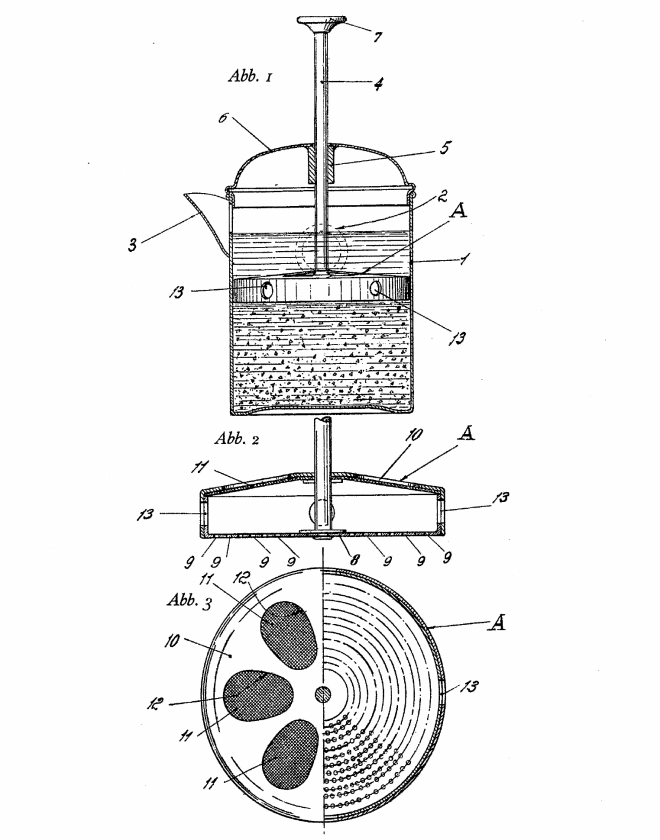 The story captures the imagination, and some details appear to prefigure actual historic records of a patent for “une cafetière a pression et filtrage instantaner” (a coffee press with fast filtering) filed in Paris by Henri-Otto Mayer and Jacques-Victor Delforge on March 27th 1852 [ref.]. However, this first filter design used cloth as the filter and use of wire mesh is only recorded in 1929 – the story of the old man is most likely an invention!