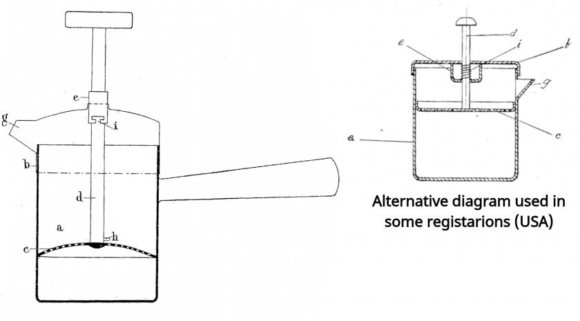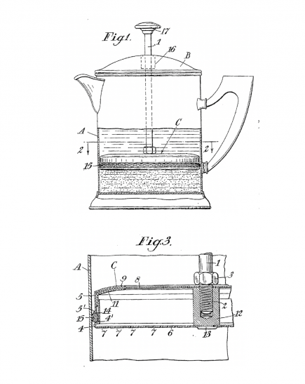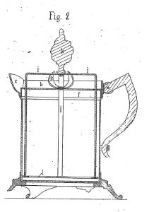 The patent diagram clearly shows a coffee-pot with a plunger device, and the benefit of this coffeemaker was the same as today; a fast and simple method of separating the unpalatable coffee grounds from the infusion. The only issue with this ‘cafetiere a pression’ is that it probably did not work very well. The critical element of a cafetiere is the filter, what it is made of and how well it separates the sediment from the coffee. The Mayer Delforge patent only refers to ‘flannel’ or some form of suitable filtering cloth and there was no means described of ensuring a good seal between the filter disc and the walls of the coffee pot. As a result, it is likely that an excessive amount of sediment will have escaped the seal, resulting in a rather gritty cup of coffee, full of sediment.