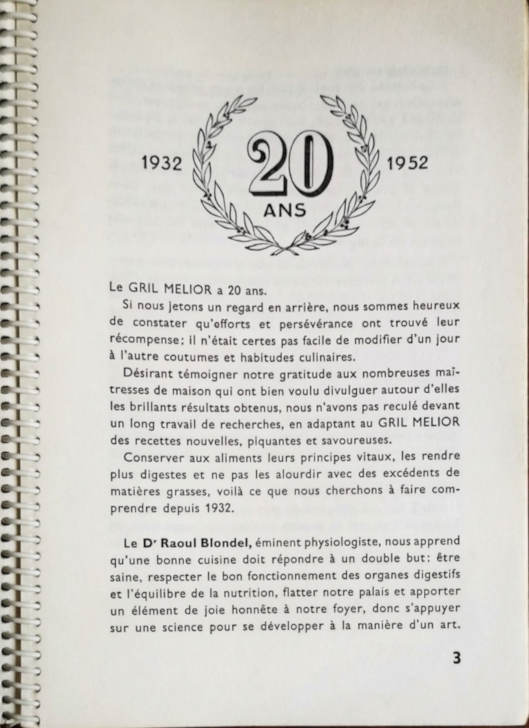 A Melior Gril Four recipe booklet printed in Switzerland from 1952 illustrates the connection between Melior Gril Fours and cafetières and Faliero Bondanini. The booklet celebrates the 20th anniversary of the Melior Gril, presumably referring to an original design by the Moneta company of Milan in 1932. The passage describes the mission since 1932 has been to promote healthy cooking by preserving vital nutrients and making food easier to digest through avoiding excess fats. It concludes with a quote from Dr. Raoul Blondel, stating that good cooking should be both a science (healthy and balanced) and an art (pleasurable and joyful ).