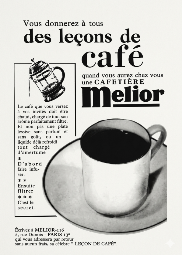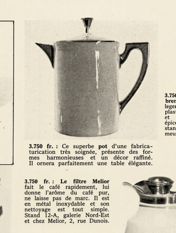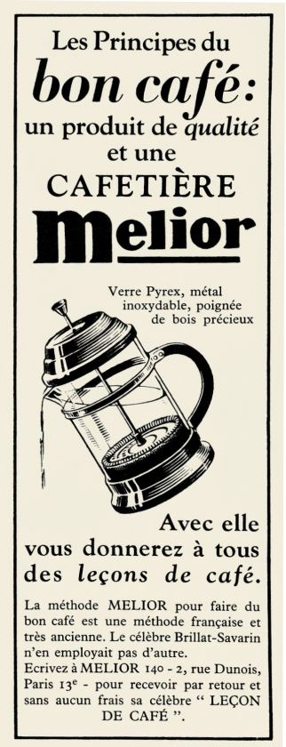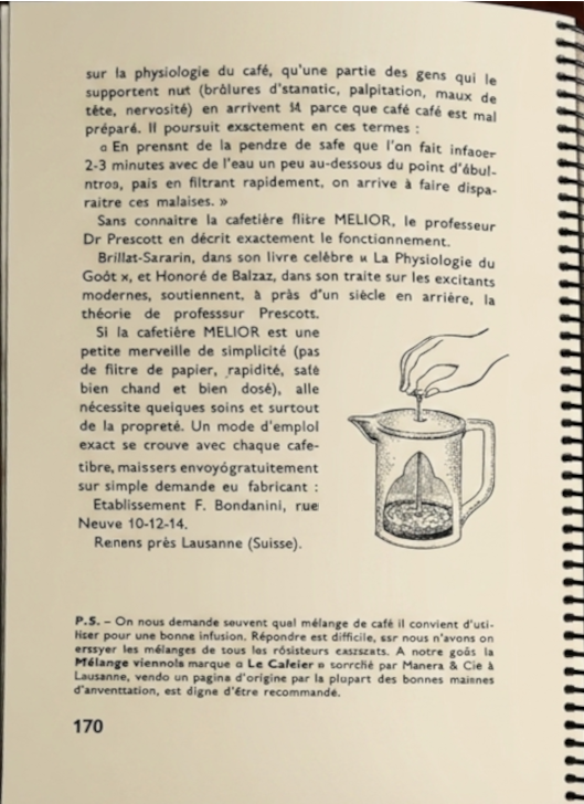 “If the MELIOR coffee maker is a little marvel of simplicity (no paper filter, speed, hot coffee is well dosed), it requires some care and above all cleanliness. An exact instruction manual can be found with each coffee maker, but will be sent free of charge on request to the manufacturer: Établissement F. Bondanini, rue Neuve 10-12-14, Renens near Lausanne (Switzerland).”