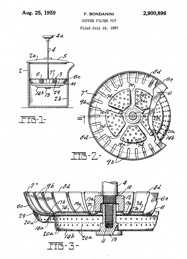 A 1950s patent registered by Faliero Bondanini for a cafetiere filter