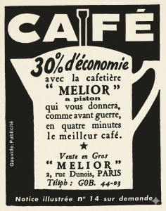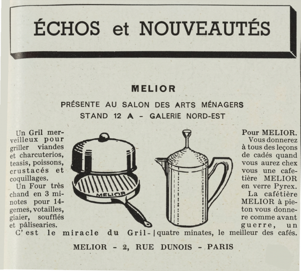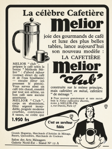 From 1948 onwards there is French newspaper advertising for two Melior brand products, cafetieres and cooking grills. These resemble the caffettiera and grills first made and sold by the Moneta company until the mid 1940’s. The advertising refers back to the previous popularity of the cafetiere by stating ‘as before the war’ or ‘comme avant guerre’.