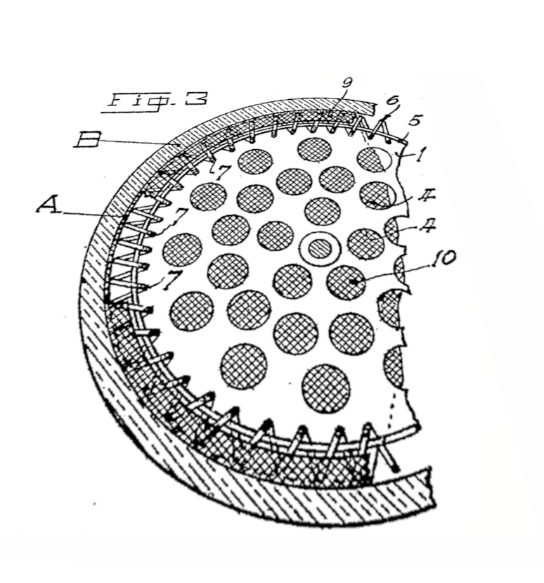 The use of ‘tongues’ is a clear, distinctive and inventive feature described in this 1955 patent registration. However, it’s a feature that does not appear to have been used in cafetiere filter design in the 1950’s or at any time since. Or if the design has been manufactured it failed to supersede the Moneta-Cassol filter, that is still the most common filter arrangement in use today.