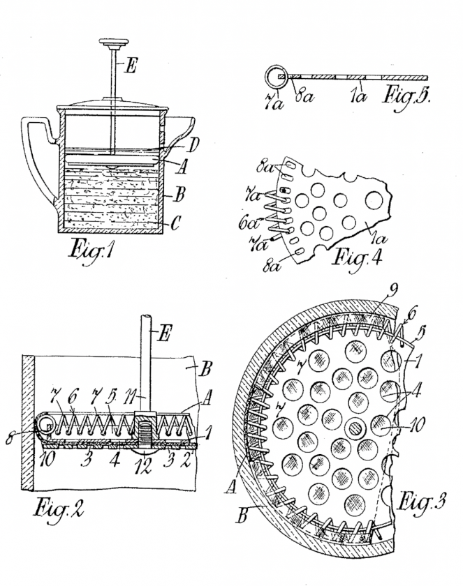 The 1934 patent fully describes and illustrates the modern cafetiere filter arrangement; two pierced circular discs ‘sandwich’ a wire gauze, the outer edge of the gauze is held against the wall of the cafetiere using a spring which is threaded through tiny holes around the periphery of the upper disc and this forms the seal which prevents sediment escaping with far more efficiency than previous designs.