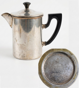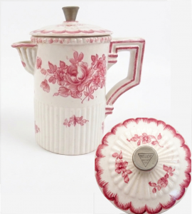 A Melior price list from 1941 illustrates the caffettiera product range that include 44 variants in different materials and product sizes. Metal versions were in nickel or chrome plated brass and tin and there was also a silver-plated coffeemaker. Ceramic versions were in simple brown earthenware and also different patterns of porcelain. The sizes of the caffettieras were measured in cups, just as todays cafetieres with 1, 2, 4, 6 8, 10 and 12 cup versions – and possibly the starting point for some confusion about just what a cup is. Melior Patent coffeemakers were sold in the UK during the 1930s, with Booths of Tunstall (Stoke-on Trent) making ceramic forms and silverplate versions being manufactured under licence as surviving examples are marked as ‘Made in England.’