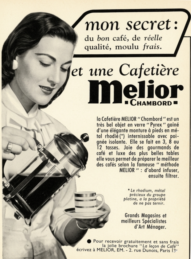 There appears to be active and substantial investment in these Melior products by the new owners SFC, with advertising in various different periodicals including Elle L’Hebdomadaire (now better known as Elle) and national newspapers including Le Figaro. These marketing campaigns include offering free recipe booklets by return of postal requests. There is also investment in the products themselves with improvements made to the cooking grills (a patent for a grill lid, October 1953 registered by a certain Faliero Bondanini); and most significantly for the history of the cafetiere, is an advertisement for the first Pyrex glass version of the Melior cafetiere in 1951 which was to evolve into the form that can be recognised in today’s cafetieres.