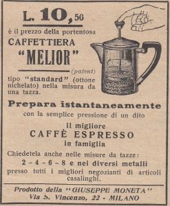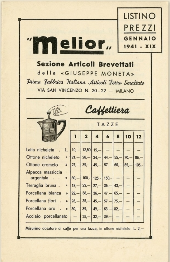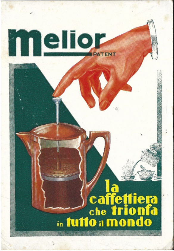 The Giuseppe Moneta Company owned Melior brand of goods was marketed in Italy and in some European markets (France, UK) as well as north Africa from the early 1930’s. The brand range included various household items notably the Melior Patent Caffettiera and also grill pans. There are newspaper advertisements for the caffettiera in France as early as 1932 offering the product for sale and also seeking agents to sell this new type of coffeemaker. Melior Patent caffettieras were clearly successful and in 1935 a postcard proudly declares, ‘Melior Patent. La caffettiera che trionfa in tutto il mondo’ – the cafetiere that triumphs all over the world.
