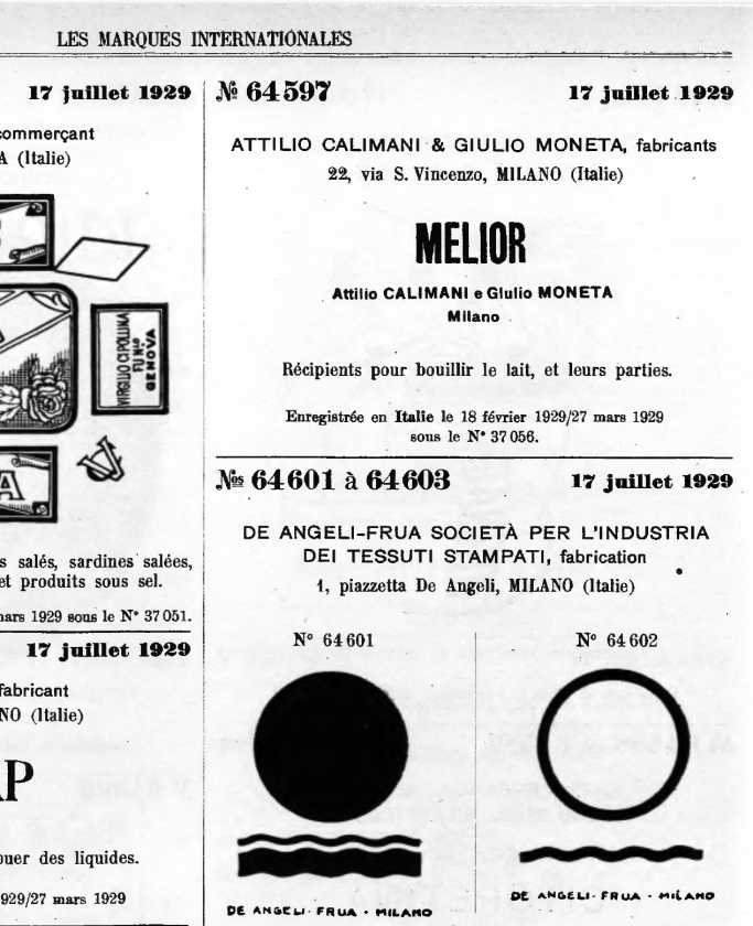 The name given to this coffeemaker made use of the nominative form of the Latin word for ‘better’; Melior. On 17th July 1929 Calimani and Moneta, publish the MELIOR trademark in Les Marques Internationales [ref], as a brand for ‘receptacles for boiling milk and suchlike’. The Melior brand soon became famous for a type of coffeemaker pre-war; and by the end of the twentieth century Melior was a byword for cafetieres in many countries. It is still a trademark of Bodum (PI Design-AG).