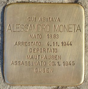 Alessandro Moneta (1883-1945), the brother of Giulio is listed in the Room of Names commemorating the dead of Mauthausen Concentration Camp [Ref]; he died in Gusen on January 20th 1945. Alessandro Moneta was arrested for offering hiding places to Jews in the giving assistance to Jews, in the Moneta factory and country residence.