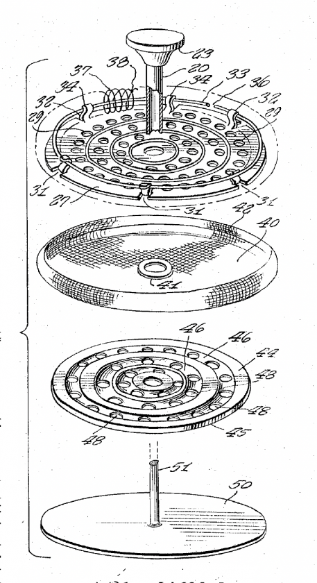 This new filter arrangement is both brilliant and simple, it uses the properties of a spring that can compress and expand to its usual state – not just from one end to the other, but also along its length at each coil. By threading a spring in and out of holes around the perimeter of the filter disc, the edge of the filter can expand and contract to conform to the inside of a coffeepot cylinder as the plunger rod goes up and down. When wrapped with a wire gauze, the filter maintains an efficient seal preventing sediment from escaping into the coffee liquid. The patent diagram is a diagram of the modern cafetiere filter system. Problem solved.