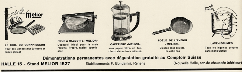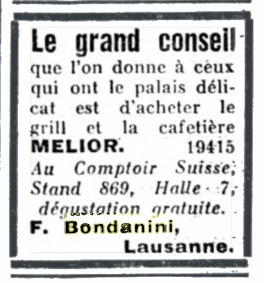 By September 1934 Faliero Bondanini was involved as an agent or distributor of Melior grills and cafetières in Switzerland. He invested in at least 11 newspaper small ads inviting readers to visit his exhibition stand at an annual national fair based in Lausanne, Switzerland: