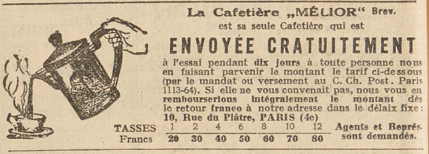 As early as 1932 there are newspaper advertisements for the Melior cafetiere in France offering the product for sale and also seeking agents to sell this new type of coffeemaker.