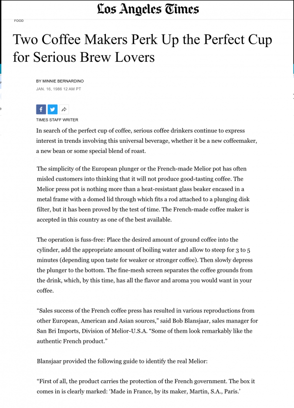 The growth of coffee shops and quality coffee during the 1980’s indicate growing consumer tastes for fresh quality coffee or ‘real coffee’. In an article dated January 16th 1986, the Los Angeles Times reviews two types of coffeemaker; an electric espresso maker (Vivalp V50 Espresso Plus) and the Melior manual coffeemaker. The article indicates that this style of coffeemaker is increasingly popular, and also assumes little prior knowledge among its readers: